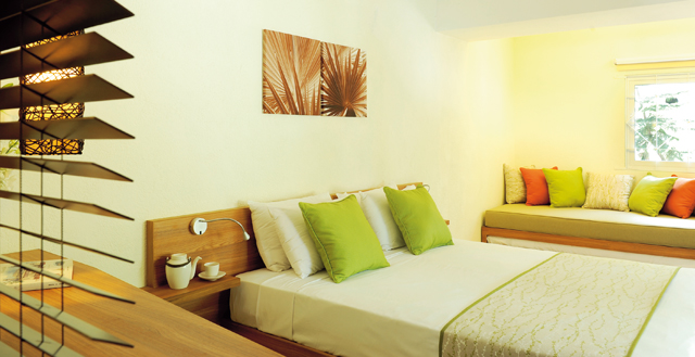 Pokoje: 61 pokoi w bungalowach (w każdym 4 pokoje) ukrytych w tropikalnym ogrodzie. Standardowe pokoje o powierzchni ok. ok. 25 m2, z łazienką (prysznic, suszarka do włosów), oddzielnym WC, klimatyzacją, telewizją satelitarną z kanałem wideo, sejfem, minibarem, czajnikiem elektrycznym i balkonem lub tarasem.